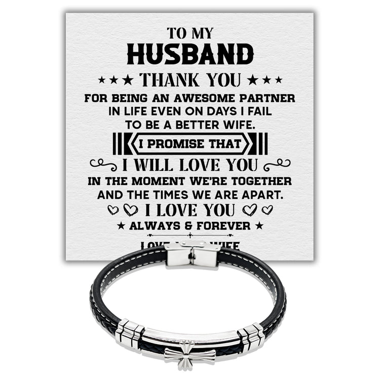To my Husband I Love You Always and Forever - Premium Stainless Steel Celtic Cross Black Italian Leather Bracelet