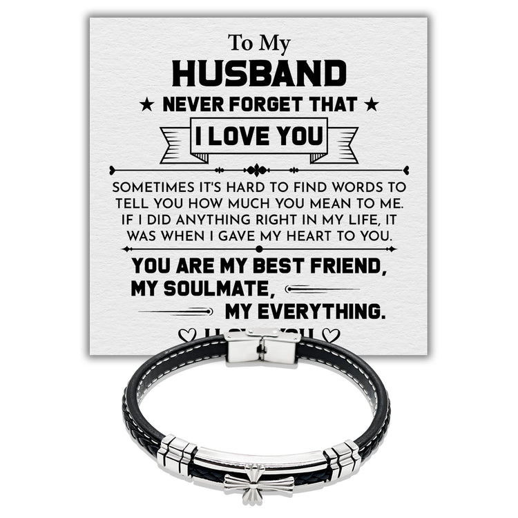 To my Husband Never forget That I Love You - Premium Stainless Steel Celtic Cross Black Italian Leather Bracelet